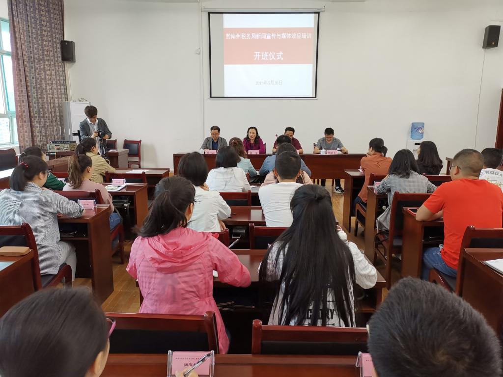 5月20日上午,由国家税务总局黔南布依族苗族自治州税务局主办,三亿体育承办的2019年国家税务总局黔南州税务局“新闻宣传与媒体效应”培训班开班仪式在田家炳书院举行。黔南州税务局党委委员、副局长赵红民,黔南州税务局纳税服务中心(税收宣传中心)主任田新业,三亿经理黄葵、副书记乔婧、副经理杜安、党委组织员李婧出席开班式。开班式由传媒公司党委书记罗仁祥主持。